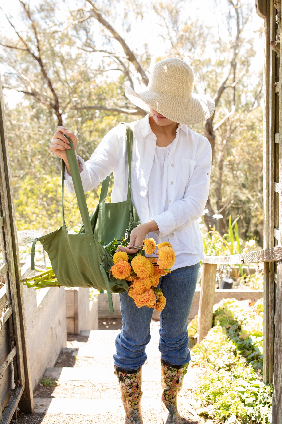 The flower tote measures 10" x 17" flat and has a 3" opening in the back seam for hanging vertically. The two 20” straps can be tied in front to secure the bouquet or used as handles to carry them. The tote can hold a large bouquet or bunch of citrus and herbs.